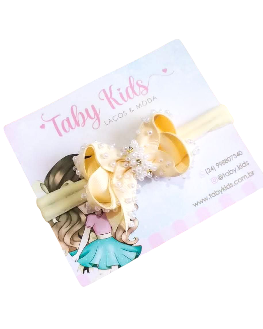 💕 Laço Luxo com bordado de pérolas e chuva de pérolas como meio de laço medindo aproximadamente 9cm. Tamanho M.